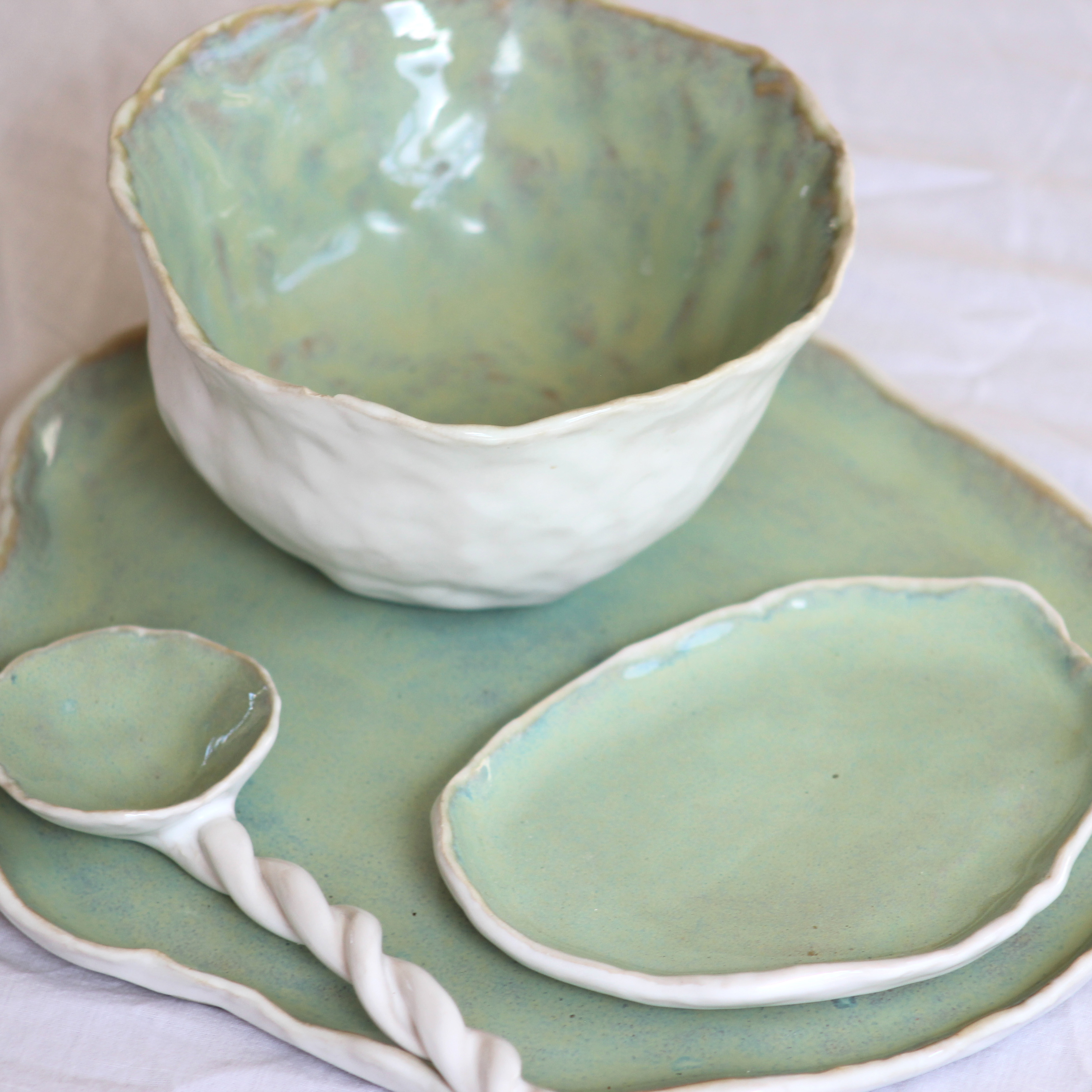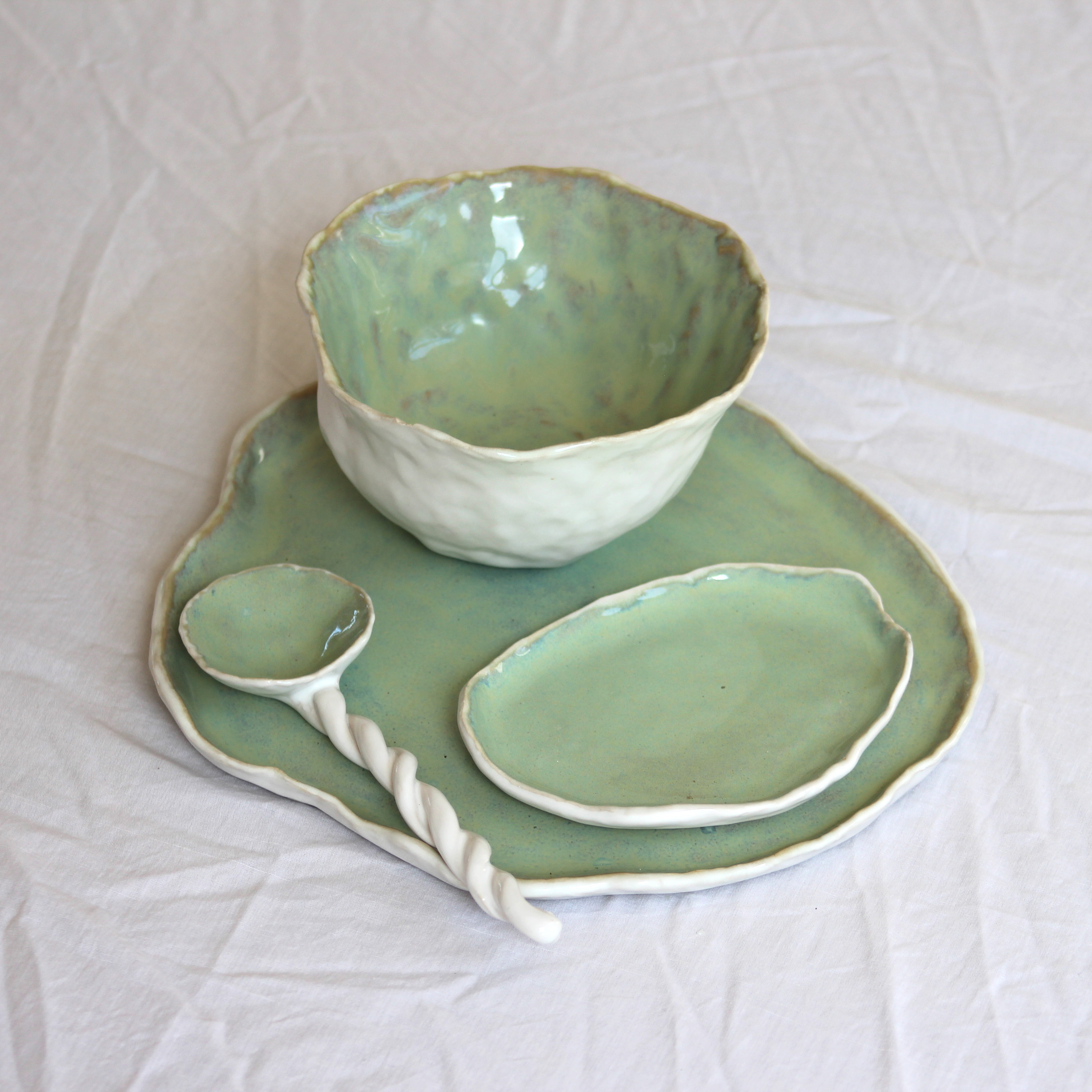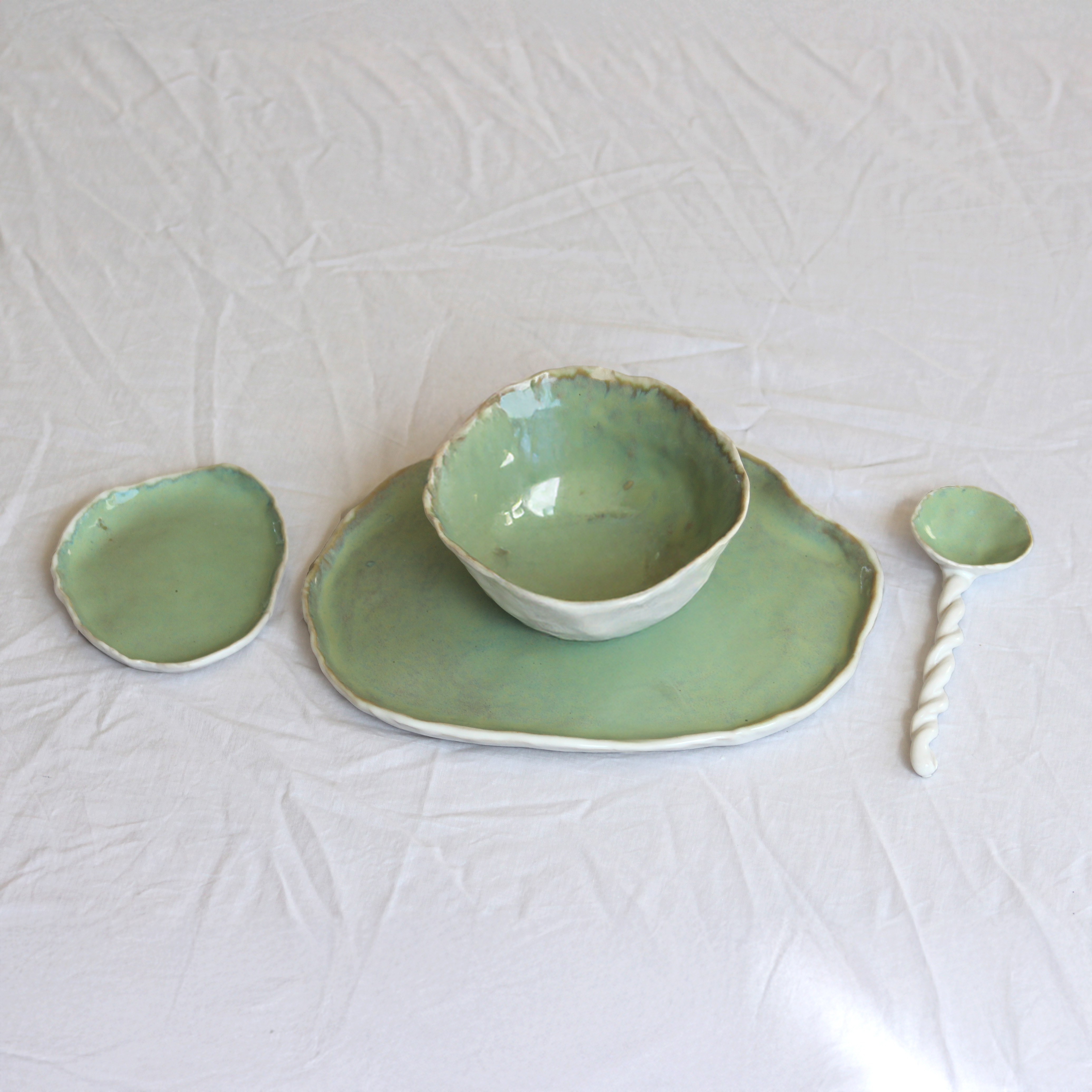 Handmade stoneware board, bowl, dish & spoon. Hand glazed with timeless meadow green.
